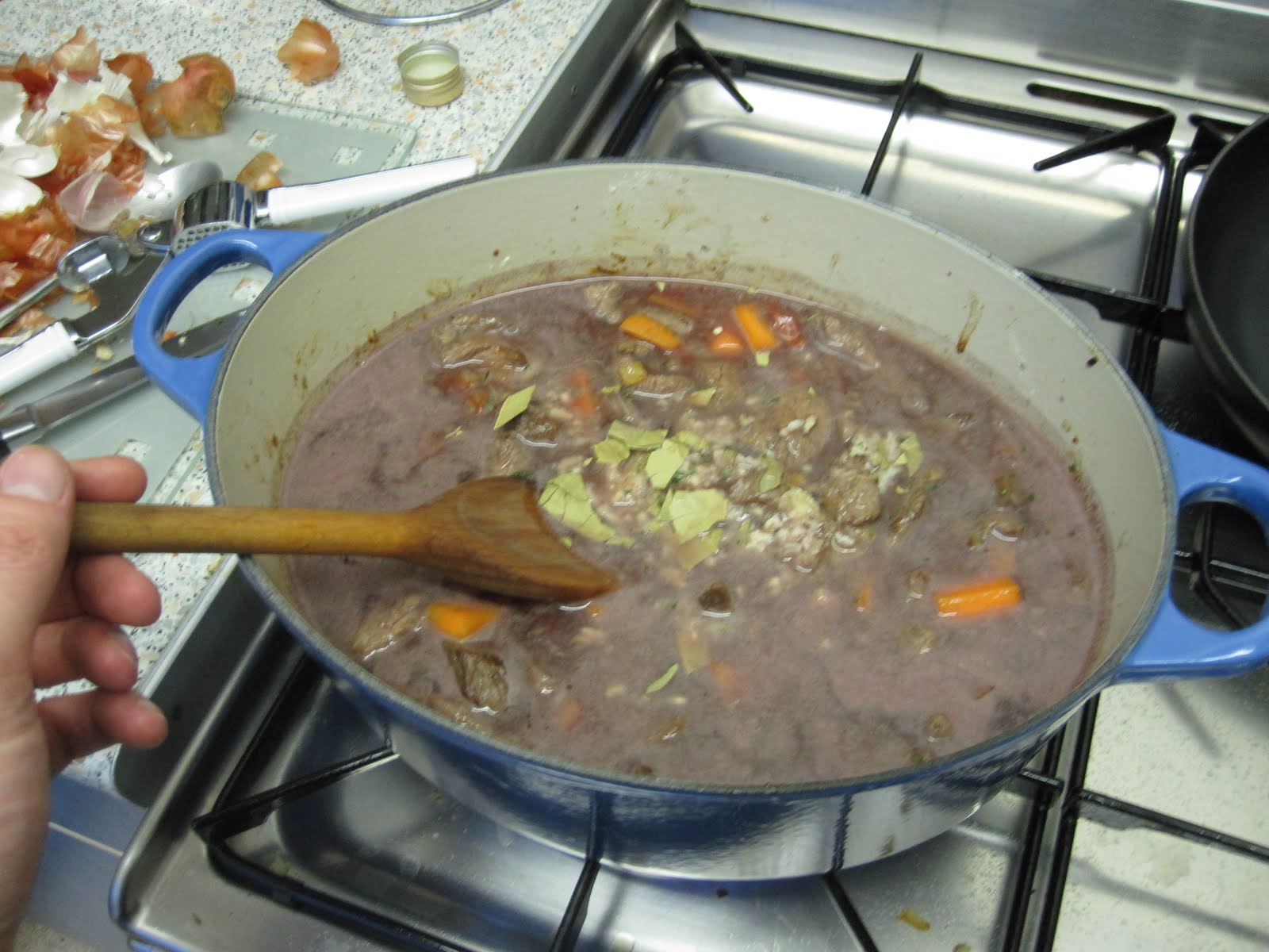 At this point, I panicked. What about the onion and the carrot that I chopped and browned in the bacon fat so dutifully? They’re still sitting forlornly in their little side tray, waiting to be asked to join the pool party with all the cool kids and swim around in the red wine, but so far Julia hasn’t given any directions like “Put the onion and carrot in NOW, stupid”. I re-read the recipe, but sure enough, Julia was silent. I immediately experienced an existential crisis – could the mighty Julia have LEFT SOMETHING OUT? In a panic, I called Gay Stephen for some micro-counselling. Fortunately, Stephen had a distinguished French guest for dinner, Christophe, and so I got to listen to Stephen asking Christophe in French what the correct procedure was for adding the carrot and the onion to boeuf à la bourguignonne. Between the three of us, we agreed that Julia probably meant for the onion and the carrot to make it into the stew before the 2 1/2 hour cookathon, so just to add them a-sap. Re-reading the recipe again, I realised that Julia was assuming that the whole recipe would be cooked in the same casserole, so at the point that the meat was browned and removed into a side tray, the onion and carrot would go into the casserole and, dammit, just stay in there, until the meat and bacon came back to the fold. This meant that the onion and the carrot should probably have been around for the strange flour-bake process and for the red wine immersion. Well, too late for that now, Julia – the flour-bake thing in particular was sooooo three hours ago, darling – but better late than never. So, in they went; finally, little carrot and onion, you too shall go to the ball.