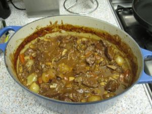 After sleeping the dead of the righteous and truly exhausted, I awoke to find the beef stew contentedly coagulating in the casserole. Back it went into the oven for a very late lunch, while I described the process to my parents over the phone. “That sounds very tasty,” said my father hopefully, while Mum expressed horror at all the butter and fat and made me promise to make it no more than twice a year.