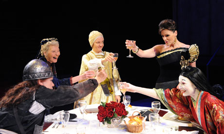 Life and art intersected interestingly last night as I dodged the unofficial evening curfew imposed in London, currently paralysed and trembling with fear in the wake of three nights of citywide riots, and headed to see a revival of Caryl Churchill’s 1982 play Top Girls. This production, directed by the play’s original director, Max Stafford-Clark, originated in somewhere called Chichester (which I believe is somewhere in the provinces) and has transferred to the Trafalgar Studios, just off Trafalgar Square, once the site of violent anti-poll tax riots at the end of the Thatcherite era. I’d ummed and aaahed a bit before going, largely because I didn’t want to repeat the disturbing experience I’d had the night before of walking home from the Tube station down deserted streets, seeing boarded up shop windows and feeling my stomach turning in knots every time I saw someone coming towards me wearing a hoodie. Thank God that my fellow theatregoer Marla Jane (herself a Top Girl) got grumpy at just the right time about the prospect of us missing out on preview tickets, giving me the sufficient degree of fear (of Jane) inspired motivation to go.