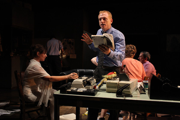 Bored and looking for distraction, our unknown ginger finds a battered looking copy of The Great Gatsby in his Rolodex, and starts to read it aloud, in the monotonous sing-song voice of someone only half committed to what he’s reading. Slowly, he becomes more absorbed in what he’s reading, smiling to himself at the first flashes of Fitzgerald’s dry wit, and we see the light in his eyes as he realises “Hey, this isn’t half bad!” Slowly, very slowly, the world of the office starts to resemble the world of the book. Things start to happen on stage that are then described in the book, drawing a look of knowing surprise from our narrator and a laugh from the audience. Then one by one, his fellow office workers slowly assume the pose and eventually the speech of Gatsby’s protagonist: the pretty blonde in the pencil skirt becomes Daisy Buchanan, Fitzgerald’s fragile heroine; the curly-haired barrel chested security guard with the John Wayne walk and the keys in his belt becomes Tom, Daisy’s bullish husband; and the tall balding loner with the profile of a Roman senator and a sad, sweet smile becomes Gatsby himself. And our narrator? Well, he’s Nick Carraway, of course, Fitzgerald’s narrator, and, like Gatsby and Daisy, an emigre from the Mid-West who is “simultaneously enchanted and repelled by the inexhaustible variety of life” in Jazz Age-era Manhattan and Long Island.