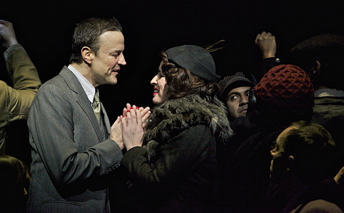 Complicite’s staging is generally quite self-conscious and almost Brechtian (though it mostly works to charm and engage rather than alienate). They’re dab hands at using lo-fi means in conjunction with sophisticated lighting and sound effects to create their own world: an actor holding a horizontal wooden bar becomes an opening window frame, and a moving box becomes variously a tram car, a drinks booth, the reception desk of a literary salon and a Satanic throne. There’s a sense of delight at the transparency with which their images are created, like a magician who insists on showing how his magic tricks are made: Behemoth the talking cat is very clearly a puppet being visibly operated onstage by two puppeteers, and the visual tricks employed to represent two spontaneous beheadings are fully revealed. Rather than pulling us out of the action, this self-conscious theatricality perversely works to engross us in the story – by reminding the audience of the act of storytelling in which we are also engaged, we are released and provoked into using our imaginations to make the story work. This seems all the more appropriate for The Master and Margarita, a story about the act of storytelling and the redemptive power of art to rewrite the past.